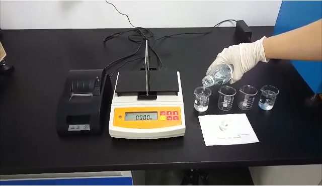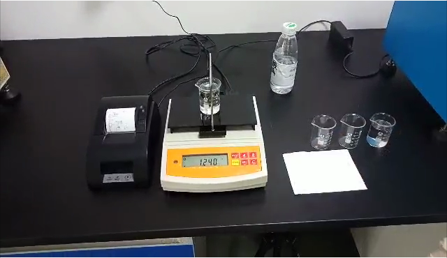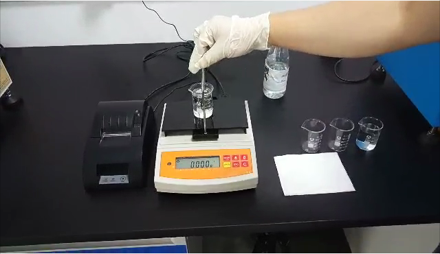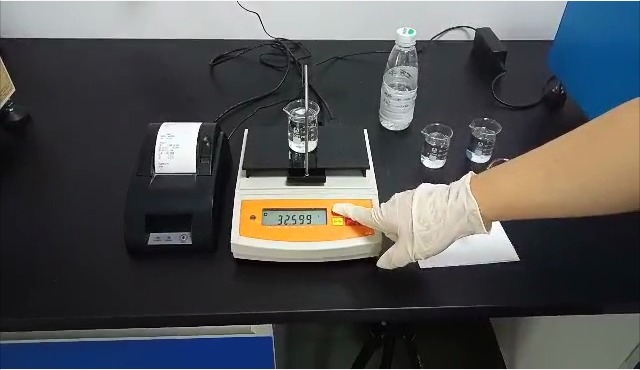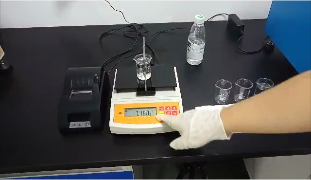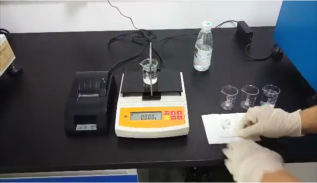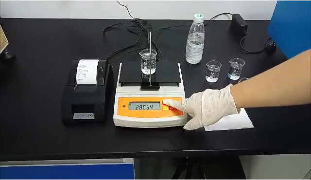 3,用掛鉤勾住測(cè)試用標(biāo)準(zhǔn)砝碼后,再將掛鉤垂吊在測(cè)試樣品的正上方,測(cè)試用標(biāo)準(zhǔn)砝碼浸沒在樣品里;