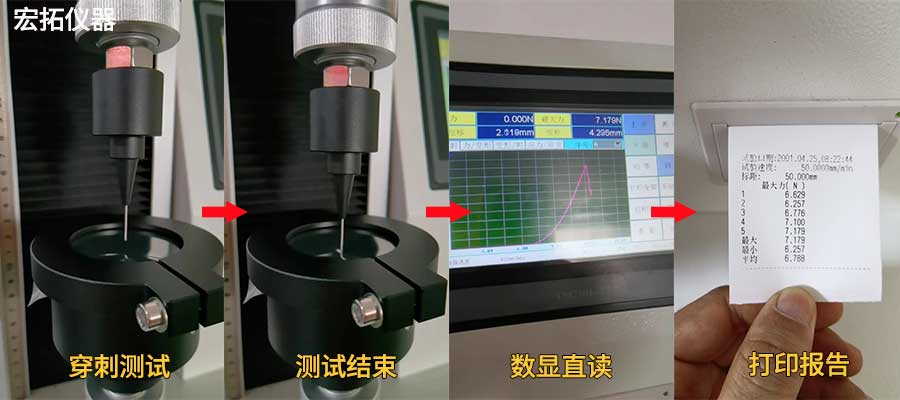 3、宏拓拉力機(jī)會(huì)自動(dòng)讀取鋼針穿透試片的Z大負(fù)荷,刺穿即可試驗(yàn)停止。測試5次以上求其數(shù)據(jù)平均值。